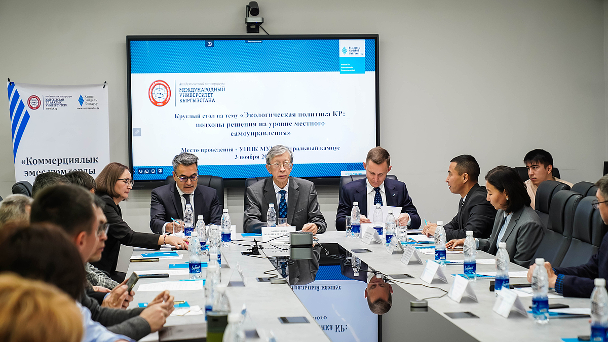 In Zusammenarbeit mit der Internationalen Universität Kirgisistans fand am 3. November 2025 ein Runder Tisch zum Thema „Umweltpolitik der Kirgisischen Republik: Lösungsansätze auf Ebene der lokalen Selbstverwaltung“ statt. Ziel des Runden Tisches war es, einen Beitrag zur nachhaltigen Entwicklung des Landes zu leisten, indem eine Plattform für den Austausch moderner Ansätze zur praktischen Umsetzung der Umweltpolitik auf lokaler Ebene geschaffen wird. Im Mittelpunkt standen Erfahrungsaustausch, die Suche nach wirksamen Lösungen für nachhaltige Entwicklung und regionale Probleme sowie die Förderung interdisziplinärer Forschung.