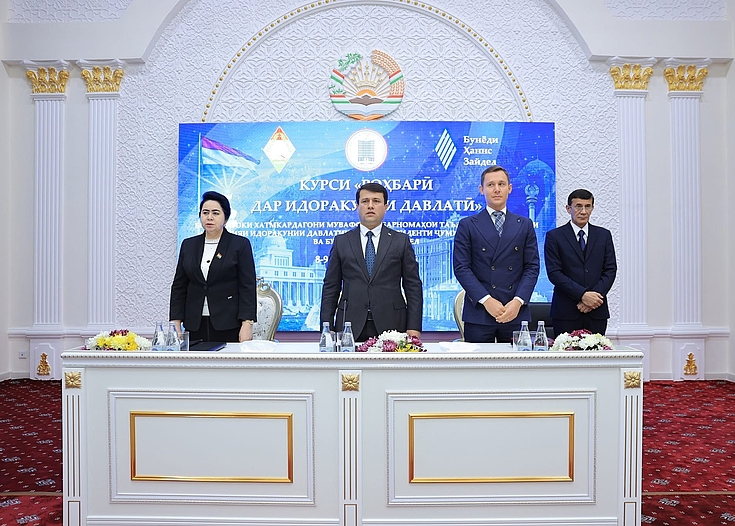 Церемония началась с приветственного выступления ректора Академии Даврона Сафарзода. В своём обращении ректор отметил стратегическую и практическую значимость курса для повышения управленческих навыков государственных служащих, подчеркнув необходимость укрепления компетенций управления, развития стратегического мышления и профессиональной подготовки кадров государственного сектора в условиях современной и сложной системы государственного управления.